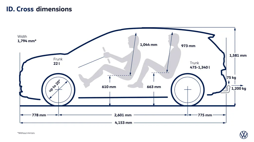 Volkswagen ID. Cross, kompakt yapısıyla dar şehir sokaklarında büyük bir avantaj sunuyor. Aracın teknik verilerine baktığımızda; 4.161 mm uzunluk, 1.839 mm genişlik ve 1.588 mm yükseklik değerleri dikkat çekiyor. 2.601 mm aks mesafesi ise tekerleklerin köşelere itilmesiyle iç mekanda maksimum diz mesafesi elde edilmesini sağlamış.